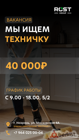 Требования:Ищем техничку (уборщицу) Нужен ответственный и аккуратный человек для уборки помещения.главное - Чистота и порядок. Оплата стабильная. Рабочий график:с 9:00 до 18:00; 5/2 (Суббота,Воскресенье)