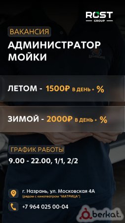 Обязанности: Контроль качества работы мойщиков; Расчёт с клиентами (наличный и безналичный расчёт); Ведение ежедневной отчётности; Поддержание порядка на территории мойки; Требования: Ответственность, пунктуальность, честность; Опыт работы администратором или кассиром приветствуется; Умение общаться с клиентами. Условия: Дружный коллектив; Стабильная заработная плата; Возможность дополнительного дохода за счёт процента. График: 1/1 или 2/2; Рабочее время: с 9:00 до 22:00; Оплата: 1500 рублей в день (в тёплое время года); 2000 рублей в день (в зимний сезон)
