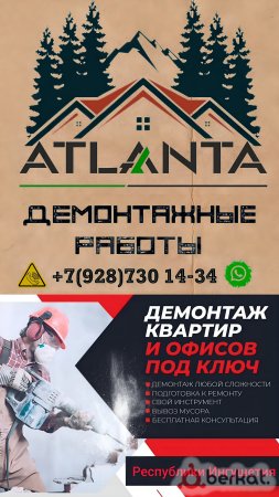 Фирма «Атланта» специализируется на профессиональном демонтаже ветхих зданий и сооружений в Республике Ингушетия. Работы выполняются опытными специалистами без привлечения посредников и предварительной оплаты. Стоимость услуг рассчитывается индивидуально после выезда бригадира на объект или оценки работ по фотографиям и видеозаписям, отправленным клиентом. Компания работает ежедневно, включая выходные дни, также доступна беспроцентная рассрочка платежей согласно нормам шариата. Контактный номер телефона: +7(928)730-14-34 (WhatsApp).