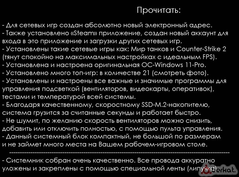 ▪ Абсолютно новый-мощный игровой системнник ▪ Все основные характеристики указаны на фотках ▪ Стильная материнка, поддерживает 6/8/10-ти яд.процессоры intel-i5/i7/i9 (10-го и 11-го поколения), встроенный Wi-Fi и Bluetooth адаптеры ▪ Подсветку (на вентиляторах, кулере, оперативках, видеокарте) можно переключать-менять на любой вкус, через пульт и специальные программы и приложения (все они уже установлены) ▪ Установлено много популярных игр (смотреть фото) ▪ Системник собран качественно из новых комплектующих ▪ Возможен обмен (с вашей доплатой) на системник по слабее или на офисный ноутбук (с рабочим аккумулятором и без царапин) ▪ Реальному покупателю будет скидка ▪ Также за дополнительную