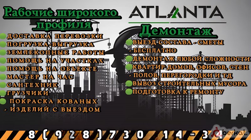 ?"Демонтаж”услуги:? ? Покраска ворот, дверей, оград, перил с выездом на дом ?Выезд состава - сметы бесплатно ?Демонтаж любой сложности ?Квартиры домов и офисов ?Вывоз строительных мусора ?Подготовка к ремонту ?Стен, полов, перегородки и ТД ?"Рабочий широкого профиля ? ?Доставка перевозки ?Погрузка-выгрузка ?Землекопные работы ?Помощь на участках ?Помощь на объекте ?Мастер на час ?Грузчики