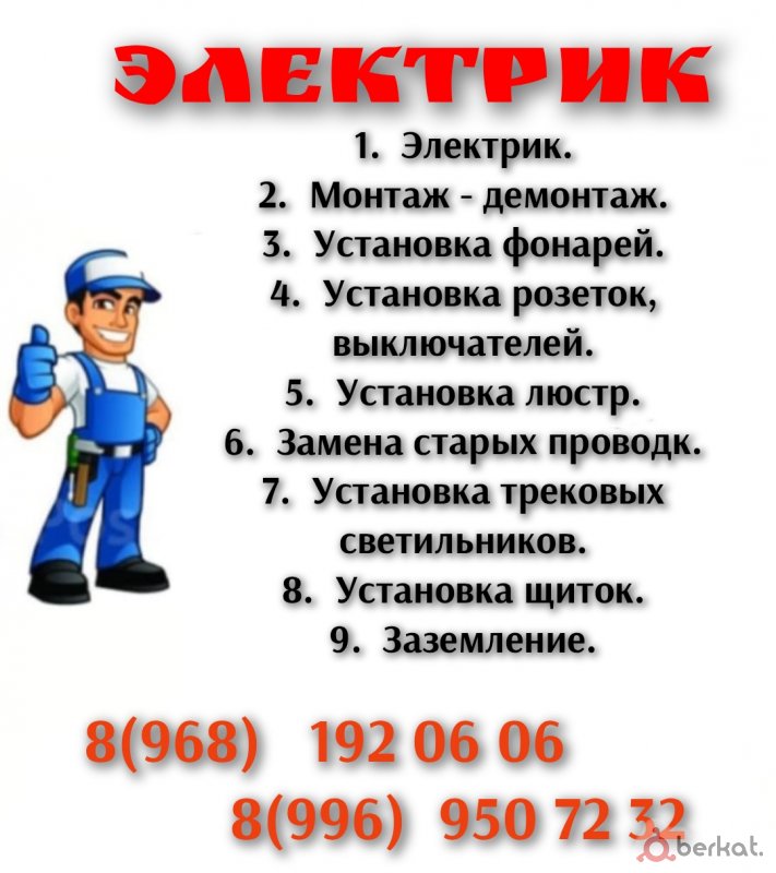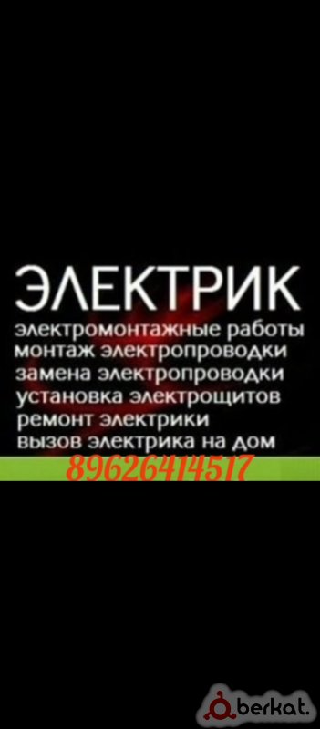 “Электрик. Стаж 4 года. Работаю по всей республике. Выполняю полный спектр работ в домах, квартирах, офисах и магазинах: монтаж и замена проводки, установка розеток, щитков и освещения, прокладка линий и работа на столбах. Установка и подключение стабилизаторов и генераторов с проверкой нагрузки. Работаю аккуратно, соблюдаю технику безопасности. На все работы предоставляю гарантию. Диагностика бесплатно при выезде с последующей работой. Если нужен только осмотр — выезд 1000 руб.”