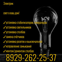 Свет в ваш дом !!! 89292622537 Установка стабилизаторов, генераторов Установка светильников Установка столбов Замена счётчиков Установка розеток и выключателей Исправление замыканий
