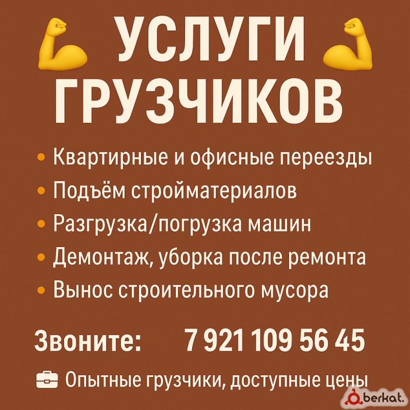 Услуги Грузчиков в Ингушетии Быстро, аккуратно, недорого! ✅ Переезды квартир и офисов ✅ Подъём стройматериалов ✅ Вынос мусора ✅ Погрузка/разгрузка фур и газелей Надёжные и опытные грузчики Есть газель при необходимости Работаем ежедневно, без выходных Звоните/пишите прямо сейчас: +7 (921) 109-56-45